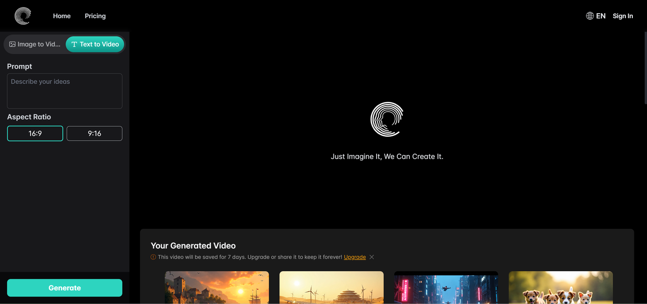 Upload an image and add a text description for your video. You can choose your video aspect ratio: “16:9” or “9:16.”