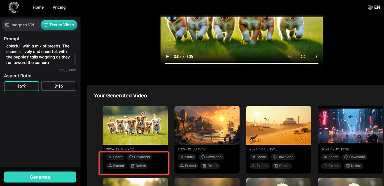 - If the generated video isn’t perfect, tweak your description for better results. - Want a longer video? Click "Extend" to make your video up to 15 seconds long, but remember this feature is available for subscribers only. - Once you’re happy with your video, download it or share it directly from the platform.